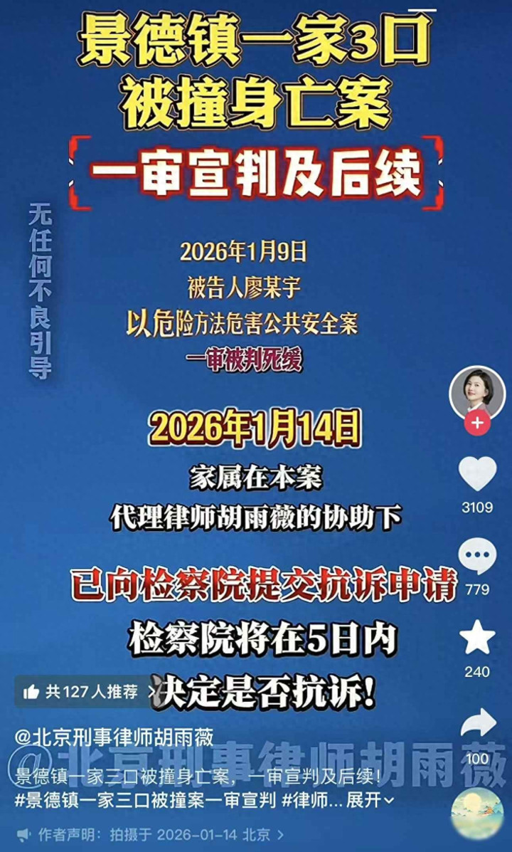 2026年1月14号,在景德镇发生了一起一家三口被车撞死的案件,家属委托了律师胡雨薇,共同向检察院递交了抗诉申请,家属不接受一审判决的死缓结果,要求改判为死刑立即执行,检察院需要在五天内决定是否启动抗诉程序,目前还没有收到相关消息。